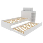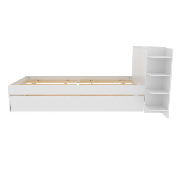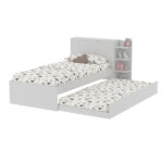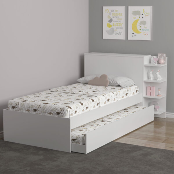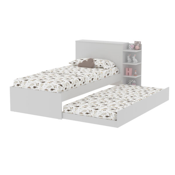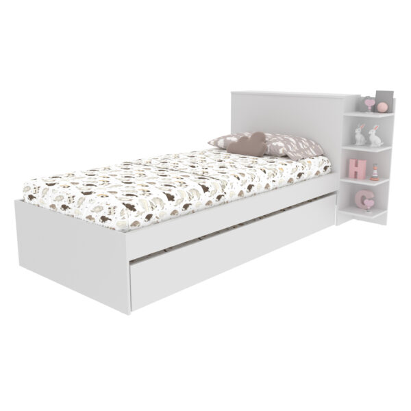 La cama infantil Gea cuenta con cuatro estantes en el lateral del cabecero permitiendo así la ubicación de diferentes objetos. Tiene una cama auxiliar .