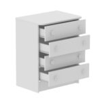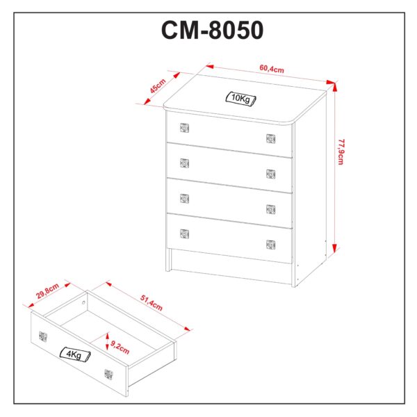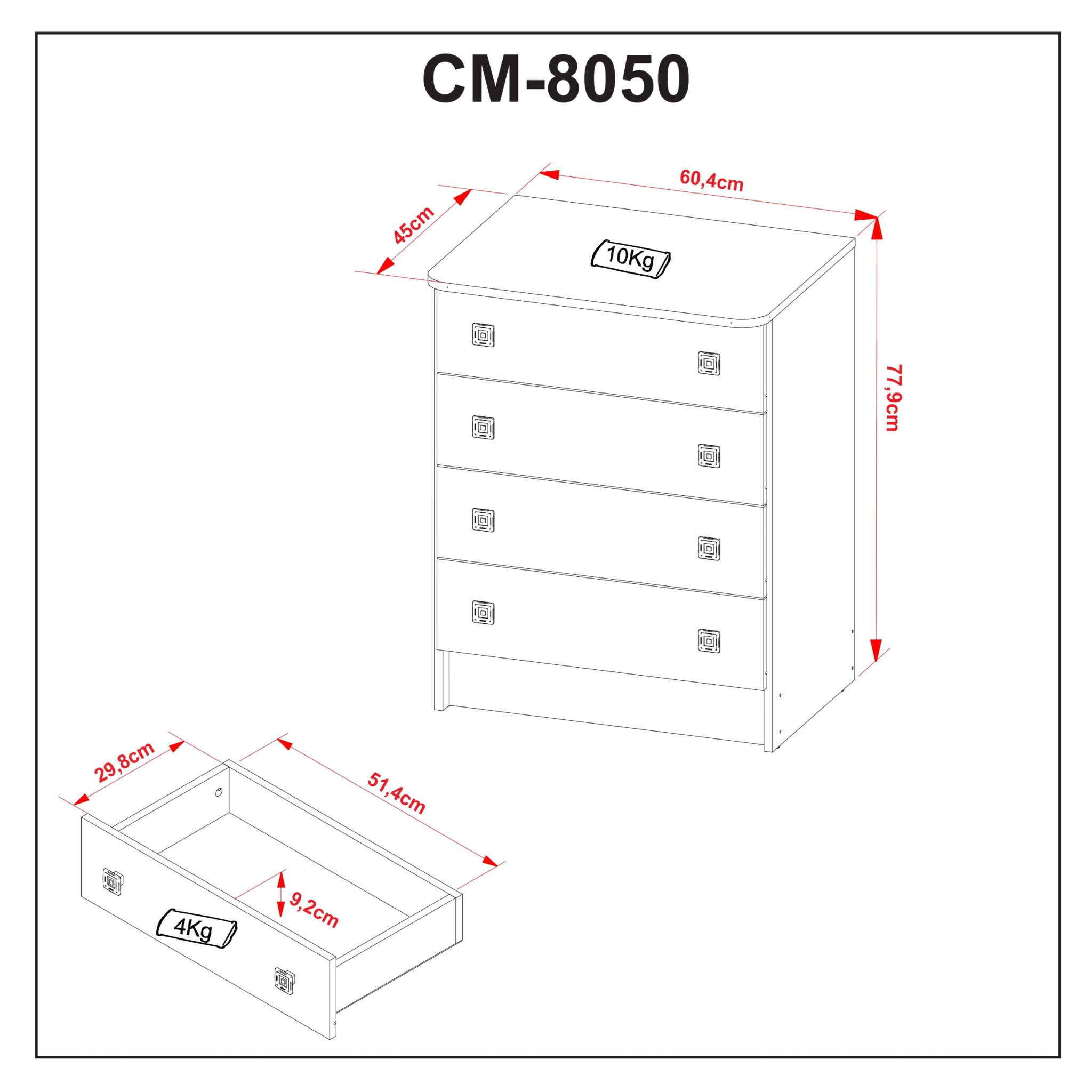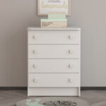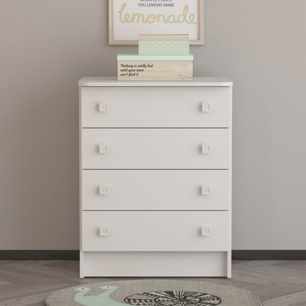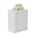La cómoda Serena soluciona los problemas de almacenaje gracias a sus cuatro amplios cajones que incluyen correderas metálicas y su diseño integra manijas en forma de estrella dándole un detalle especial al mueble.